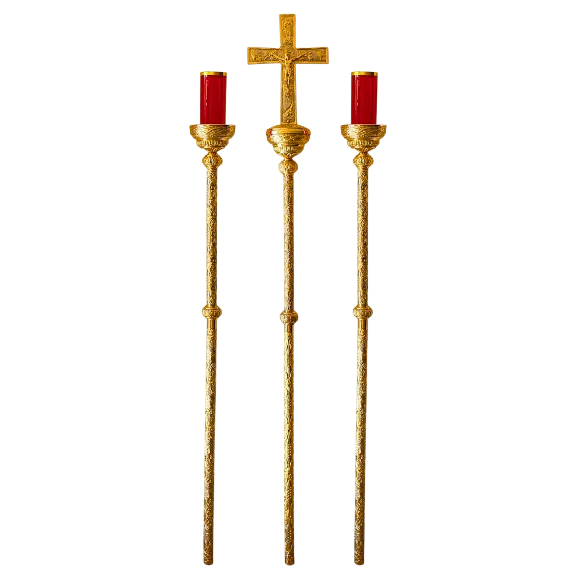 Incluye: 2 ciriales, 1 Cruz Alta y 8 vasos en los colores litúrgicos: rojo, morado, verde y transparente.